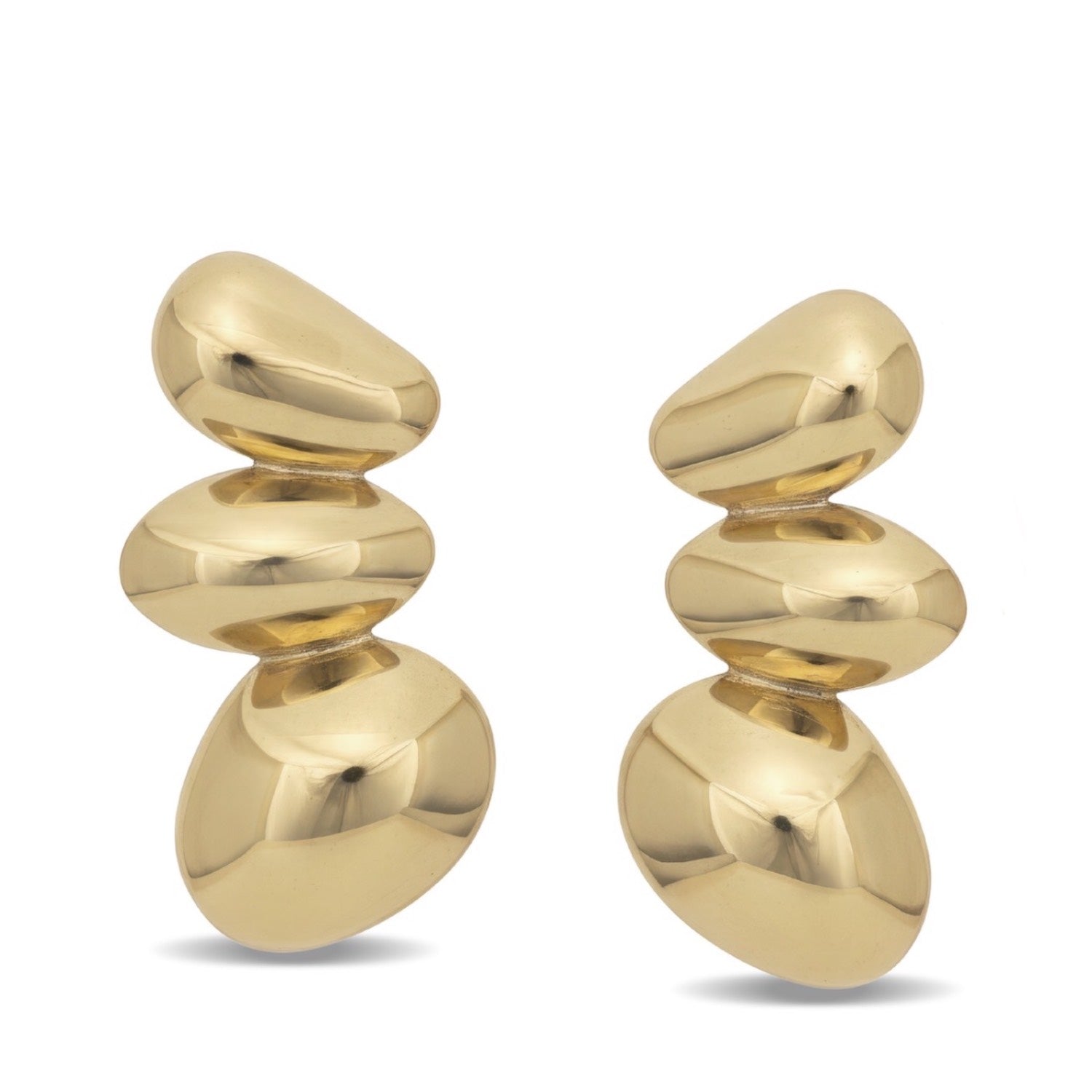 Sculptural earrings inspired by the natural shape of seeds. Each piece is stacked to create a bold, fluid silhouette that frames the face with organic volume and soft reflections