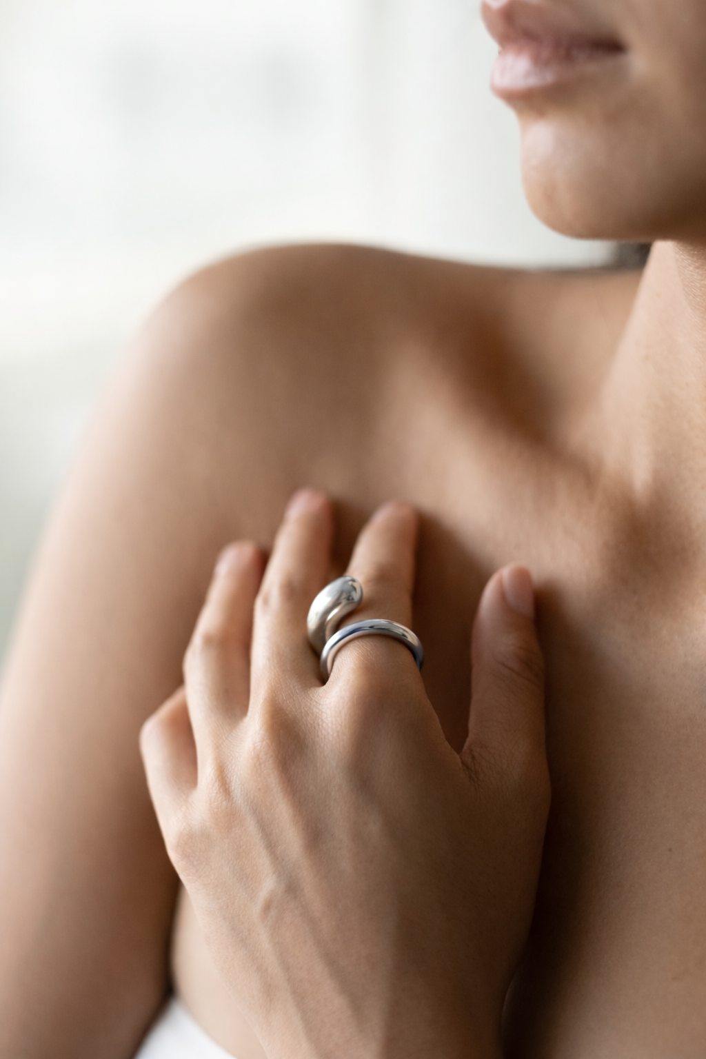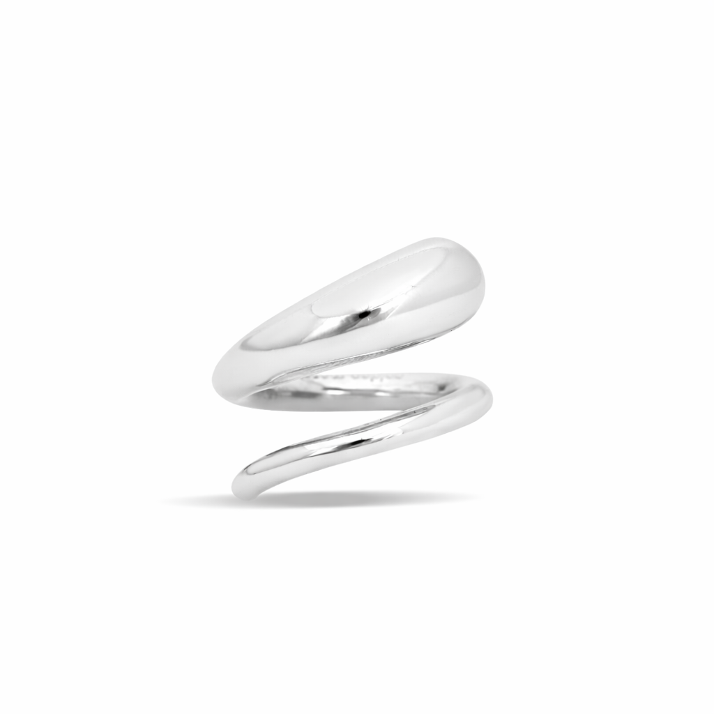 Inspired by the fluid motion of a drop, this ring wraps gracefully around the finger — a continuous flow of soft curves frozen in balance