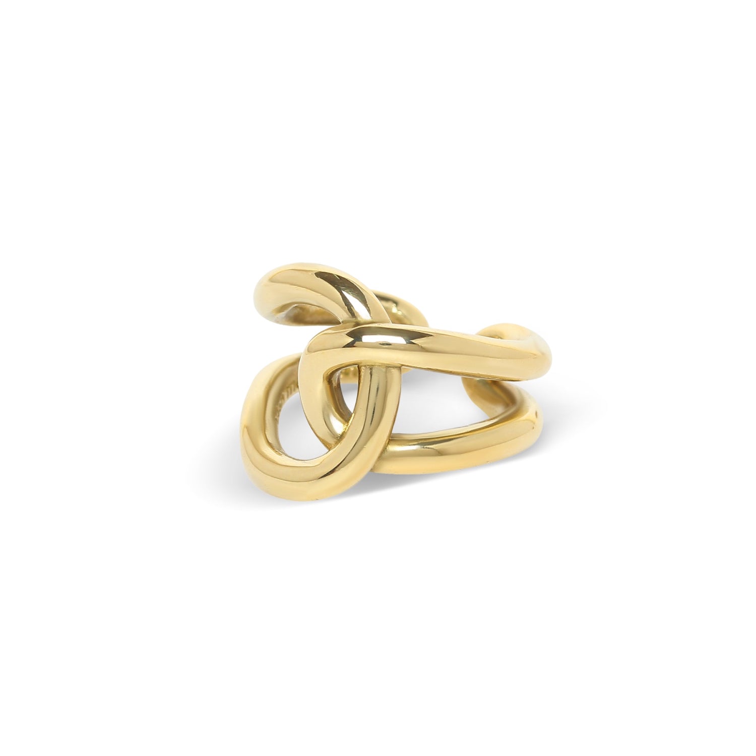 Ring of interwoven shapes that open and cross naturally, creating a fluid and lightweight silhouette with sculptural presence