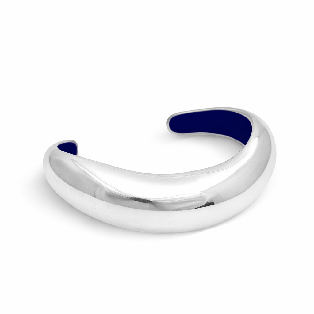 A sleek, sculptural bangle with an irregular, fluid contour that follows the natural movement of the wrist