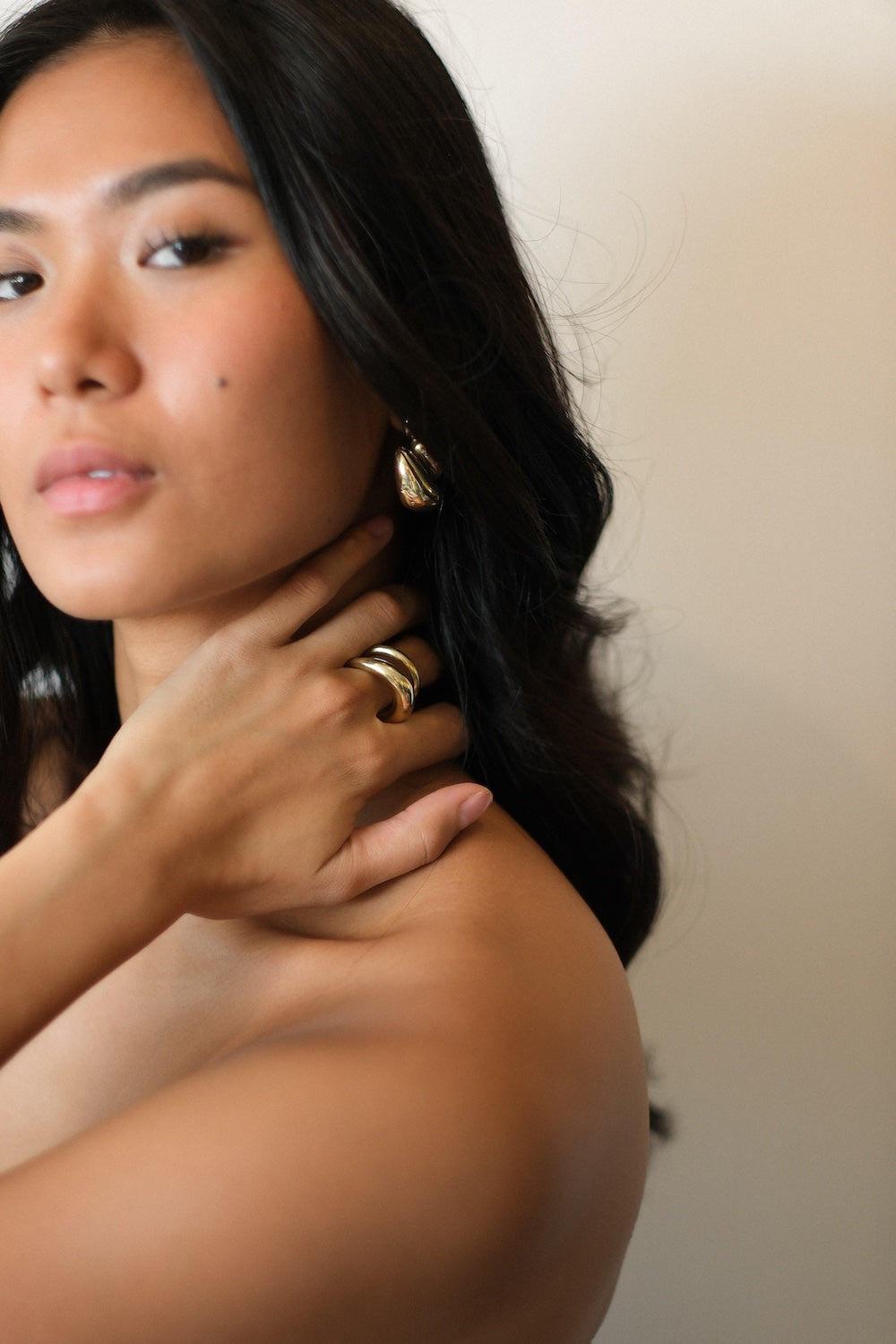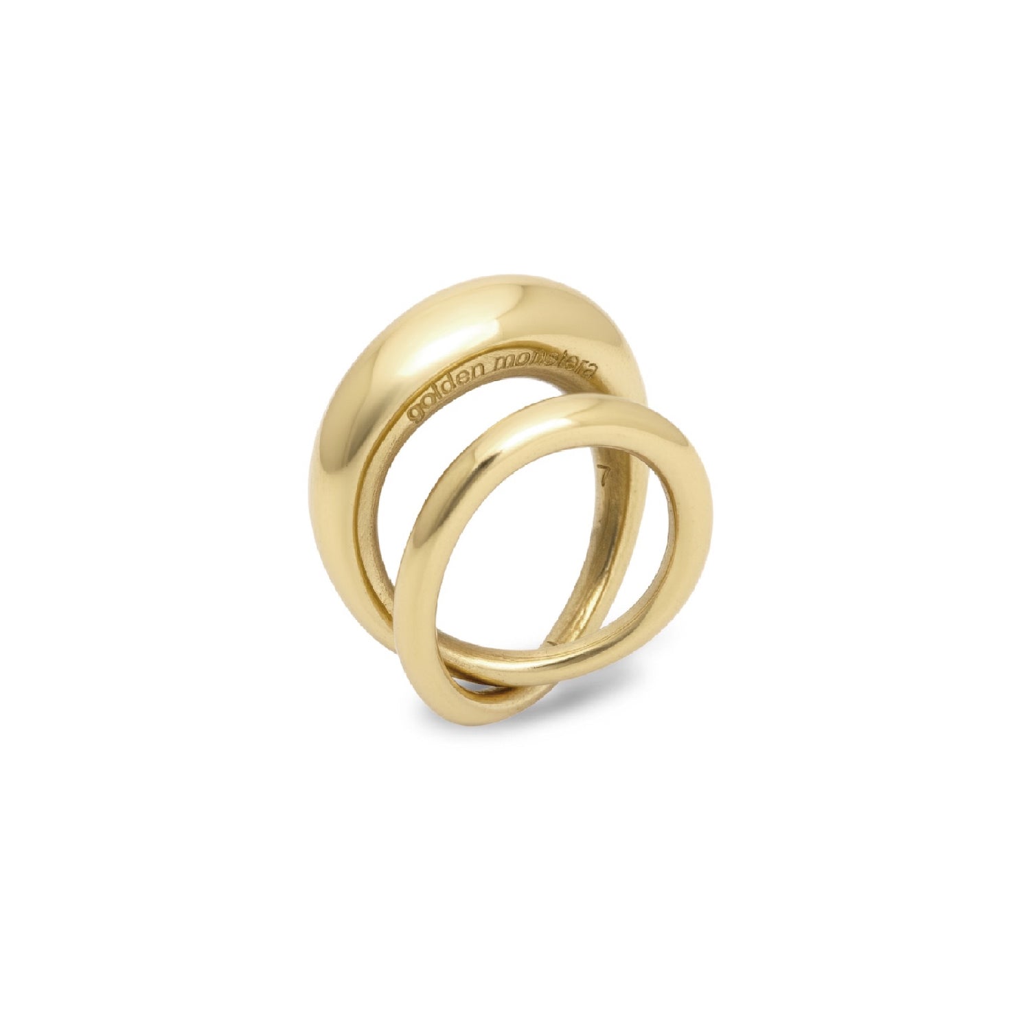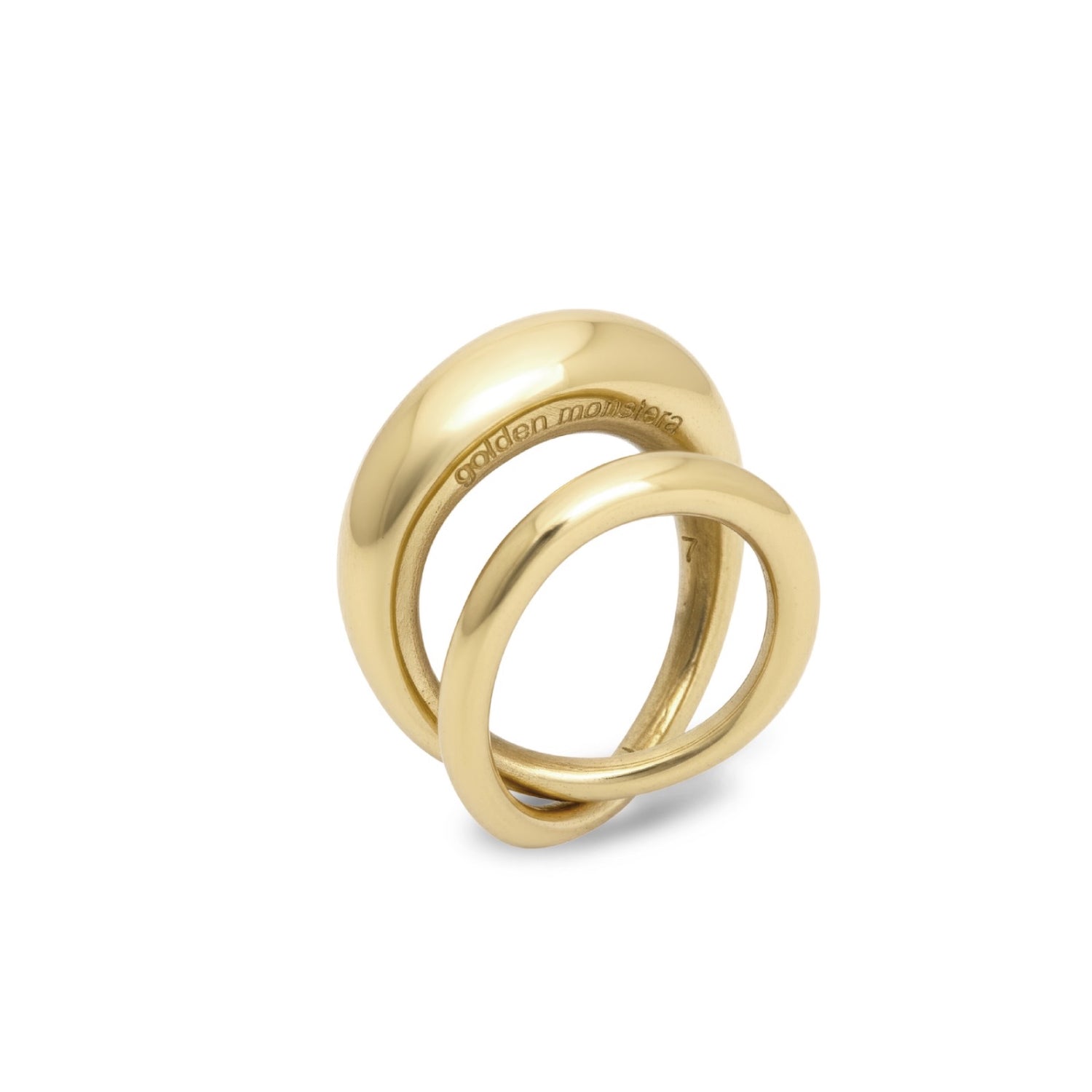 A ring defined by two interlocked curves that create a bold, continuous silhouette. Its rounded profile forms a soft, flowing loop that wraps the finger with gentle volume