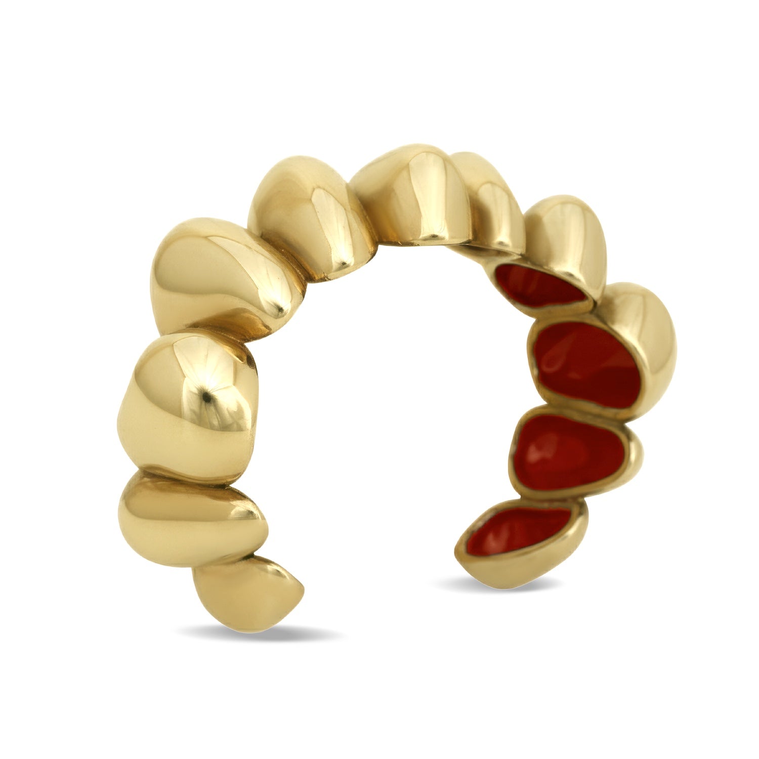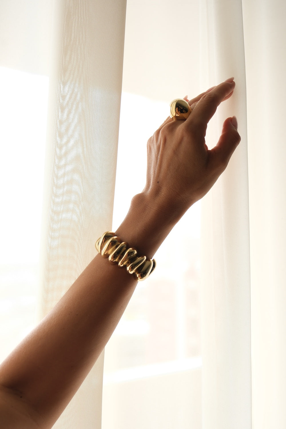This piece is defined by a continuous rhythm of rounded, sculptural forms that create a bold, dimensional silhouette around the wrist