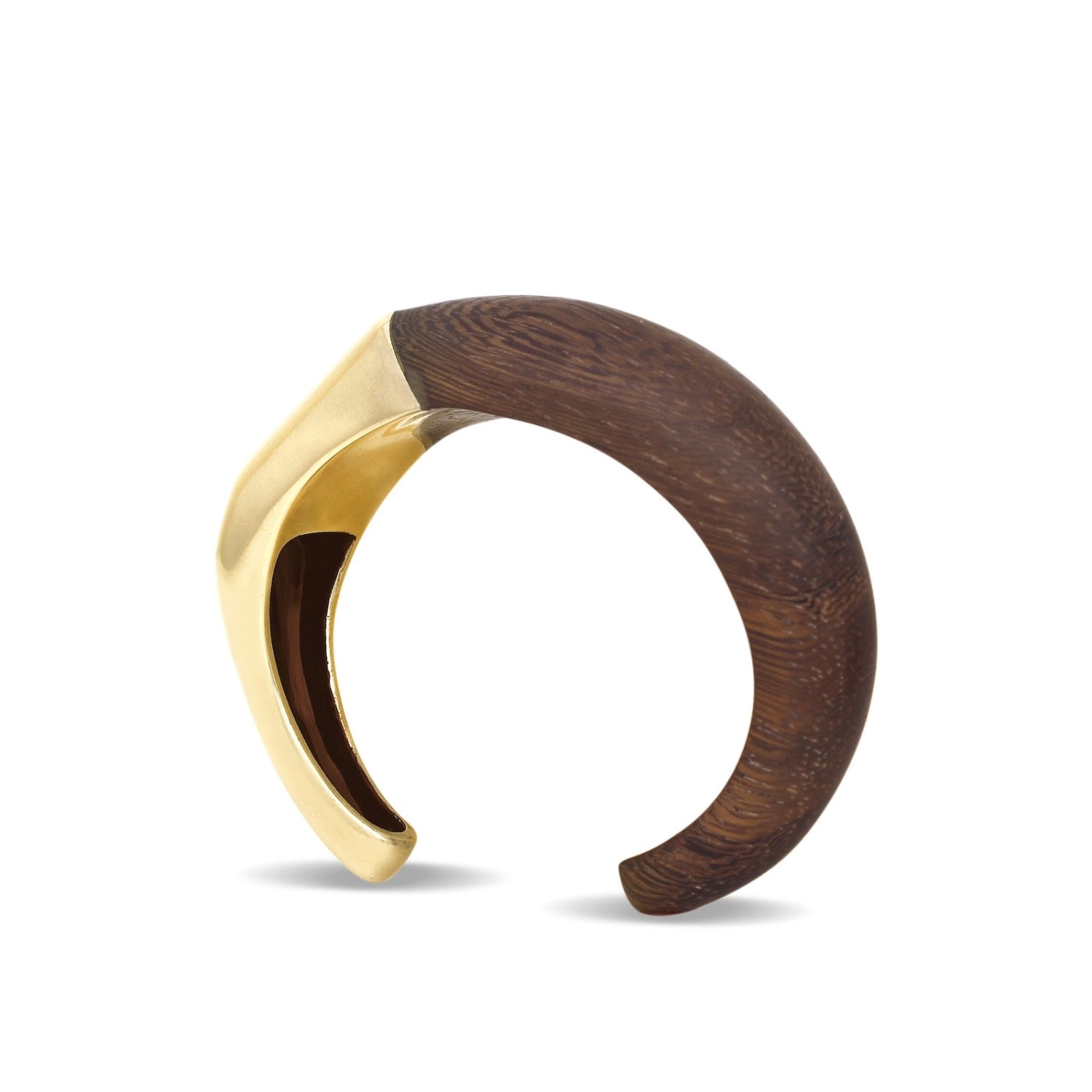 A sculptural bangle that pairs smooth, polished curves with the warm texture of carved wood. Its tapered, open silhouette offers a bold yet natural feel