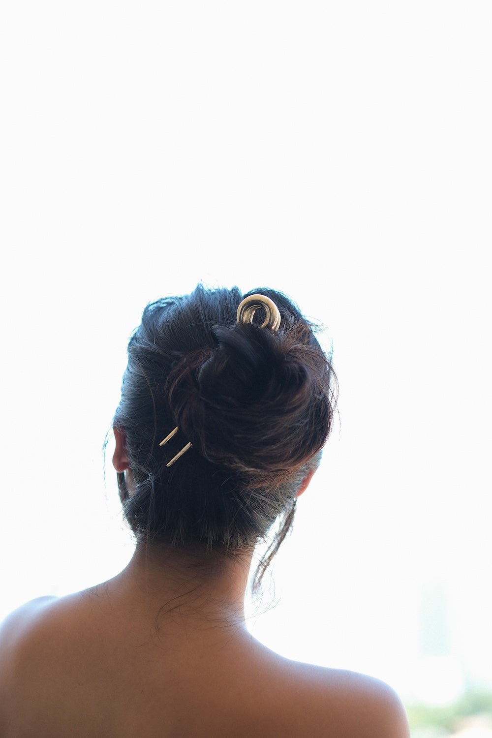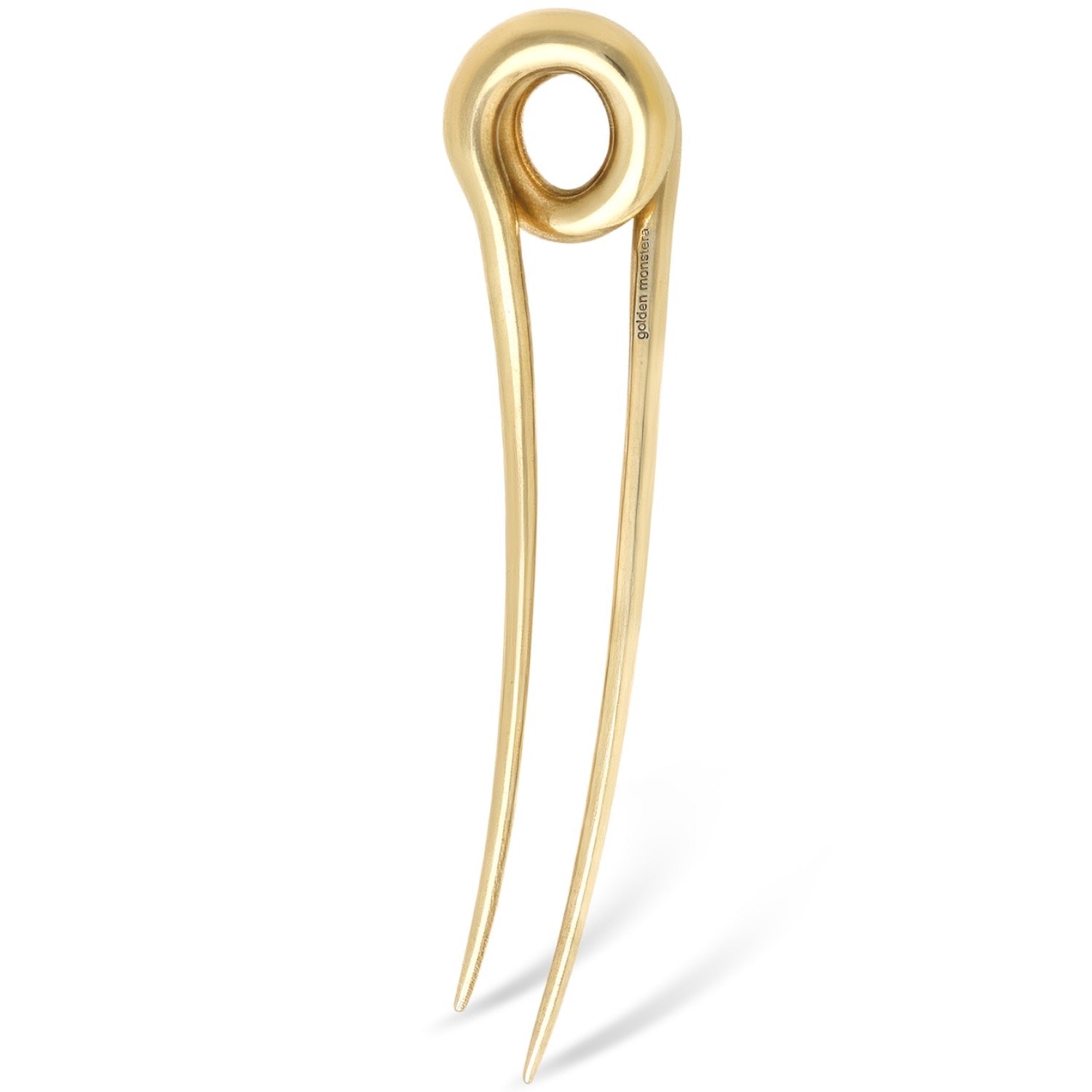 Its flowing lines create a sense of movement while holding the hair with a refined, sculptural touch