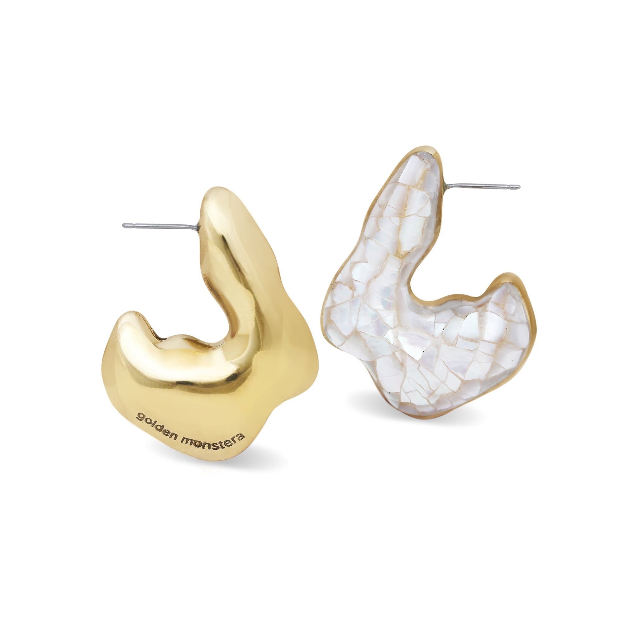 Sculptural earrings inspired by the irregular flow of liquid, featuring fluid contours, contrasting textures, and a reversible design you can wear on either side