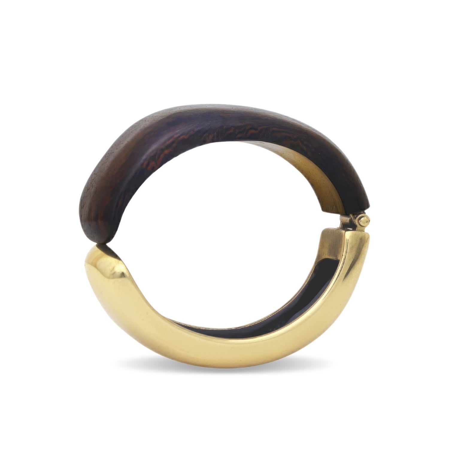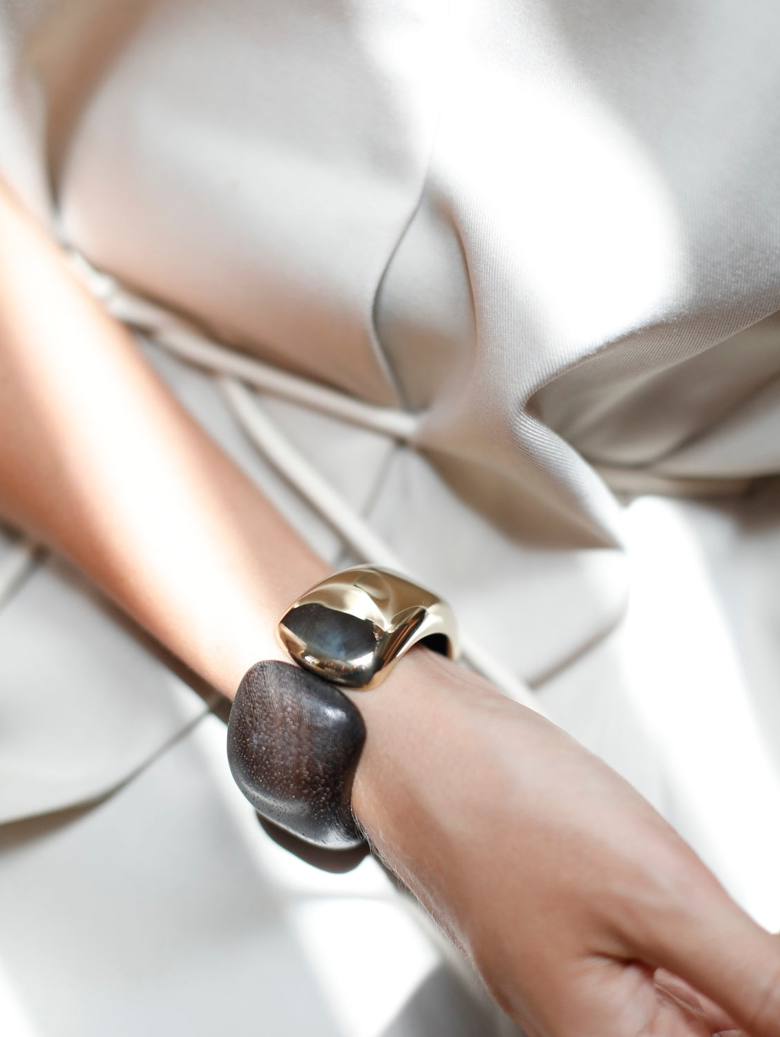 A bracelet defined by clean lines and a continuous silhouette, built from two contrasting volumes. Its curved form sits around the wrist with a balanced natural transition between both textures